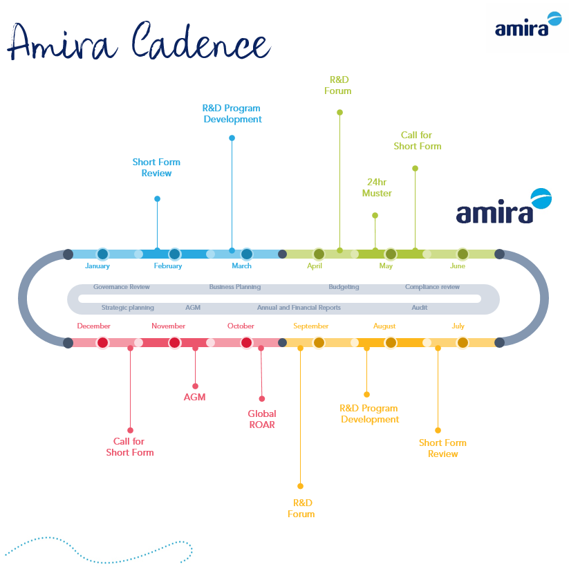 At the beginning of 2021 Amira introduced its Annual Rhythm and Cadence map. This provides a shared touchpoint of activities and focus we have with our members and the wider ecosystem, as well as a sense of the internal governance focus areas we are addressing.